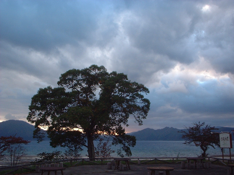 夕やけが湖に反射して眩しいです。