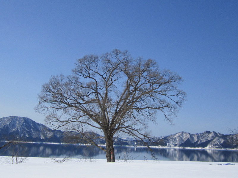 今日は天気が良くて湖がとても青く見えます。