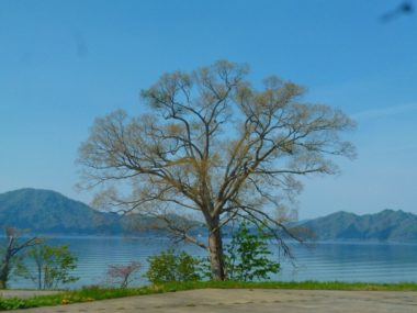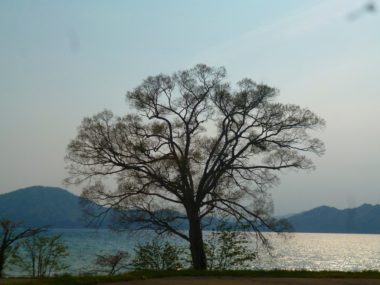 田沢湖に太陽の光が反射して眩しいです。