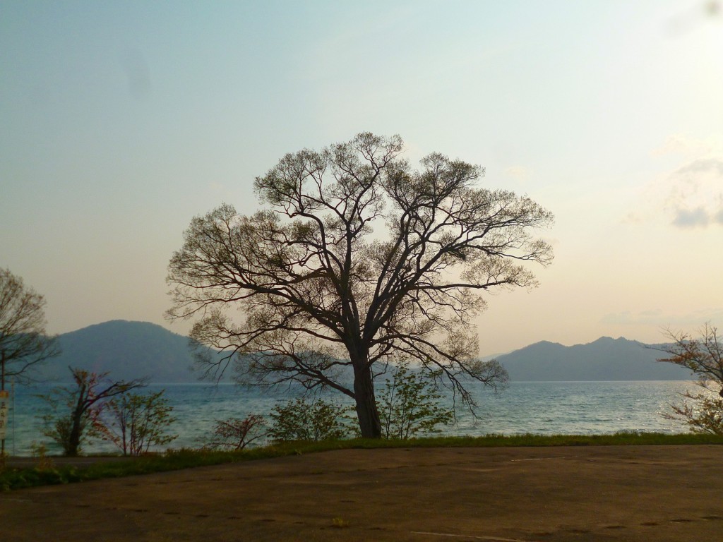 田沢湖に太陽の光が反射して眩しいです。