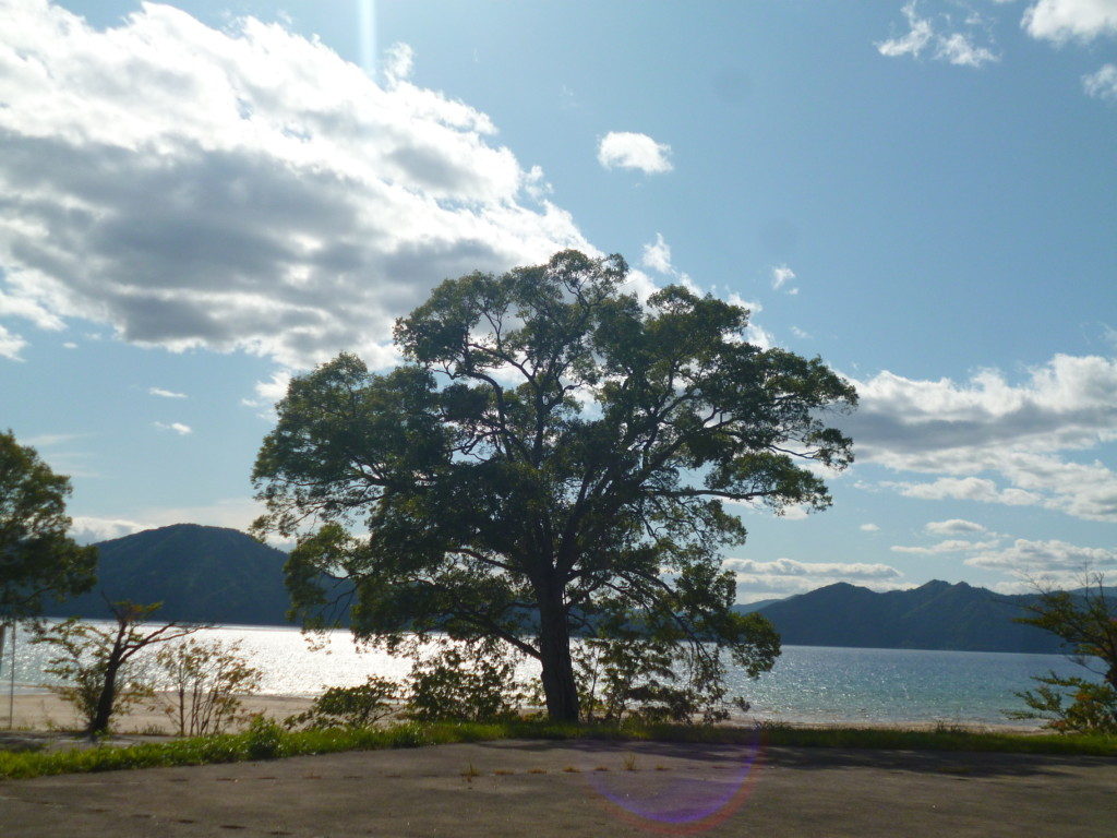 太陽の光に照らされて田沢湖はきらきらと輝いています。