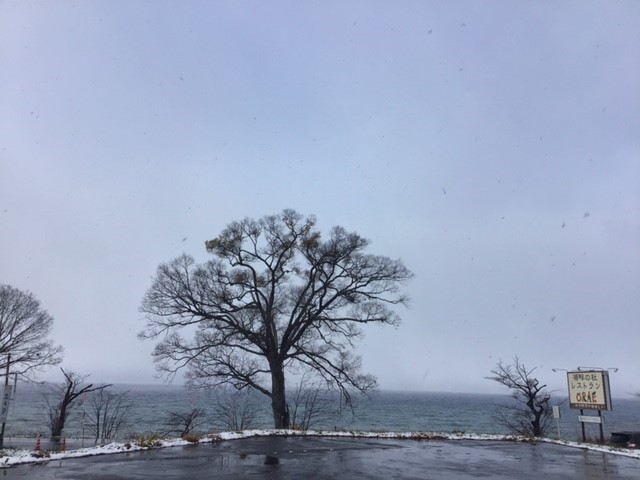 今日の田沢湖は朝から雪が降っています。