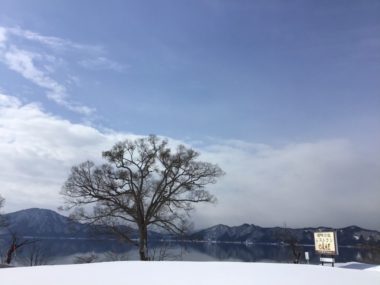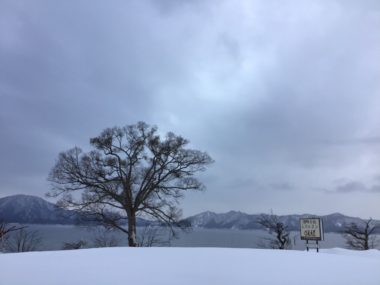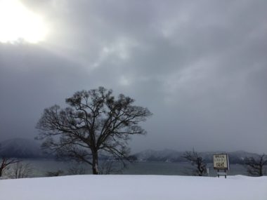 雪が舞っています。雲が多く太陽が姿を隠しています。