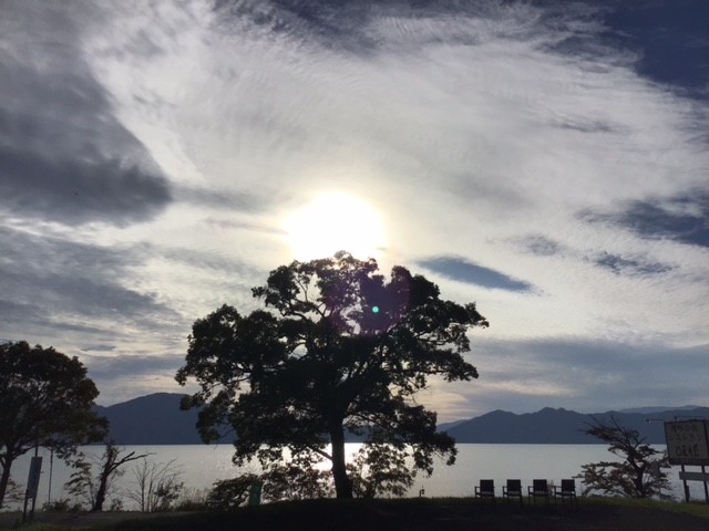 湖一面に羊雲がかかっています。
