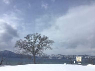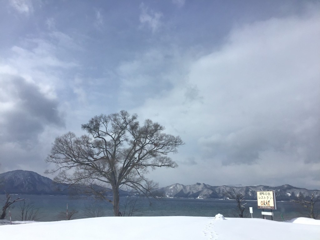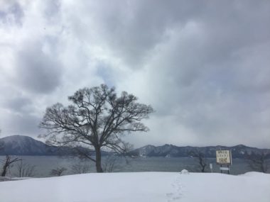 田沢湖では雪が降っています。