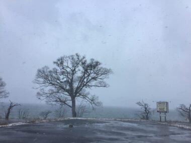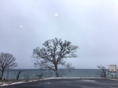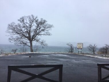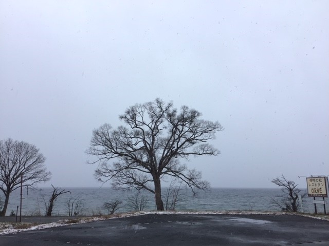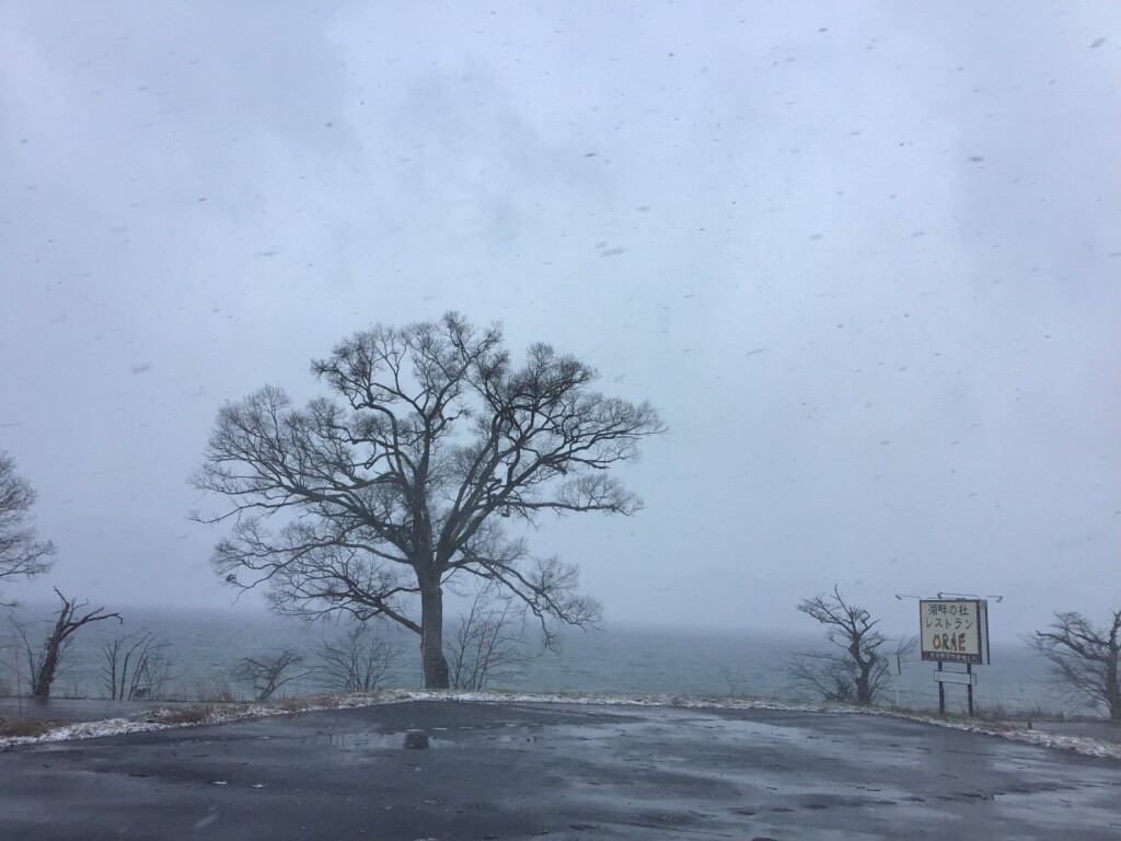 強い横風で雪が舞っています。