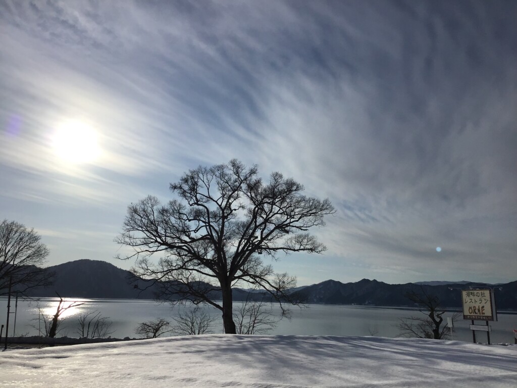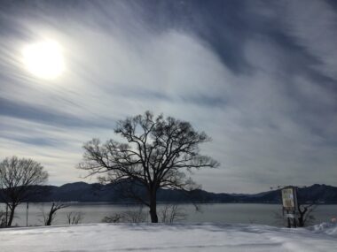 太陽の光が湖面に反射してとても眩しいです。