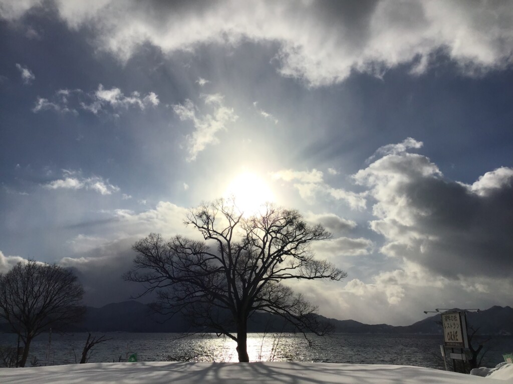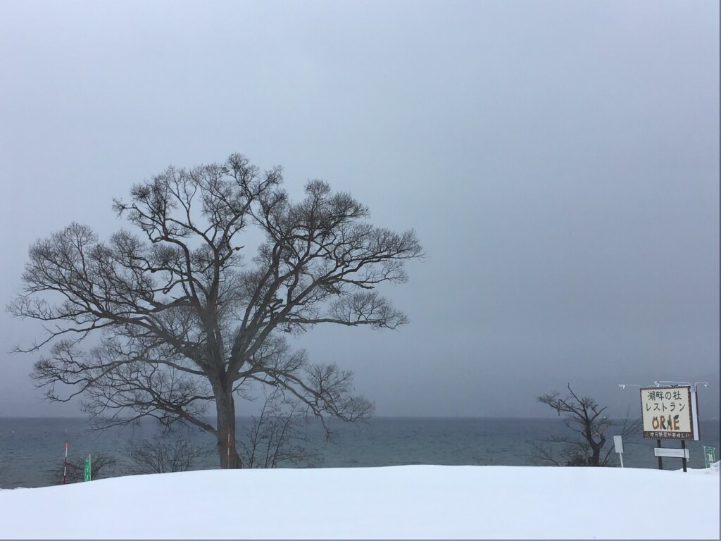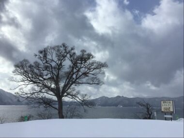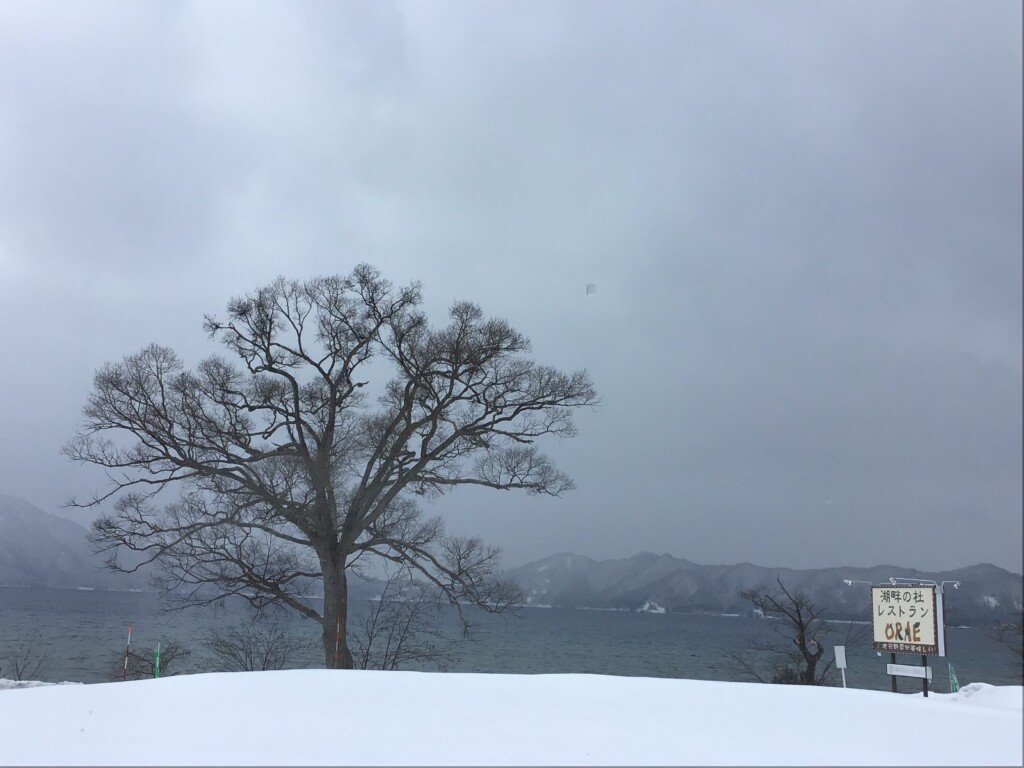 田沢湖は雪が舞っています。