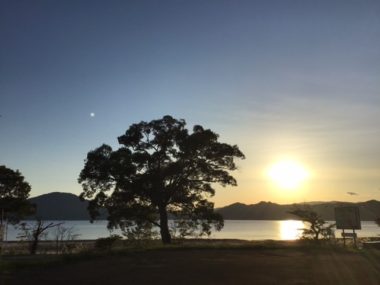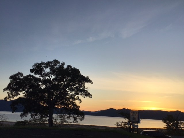 夕陽が田沢湖を照らして夕陽の道が出来ています。