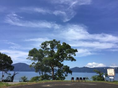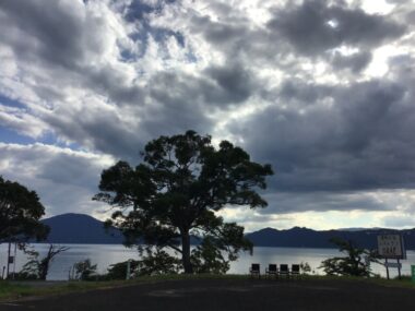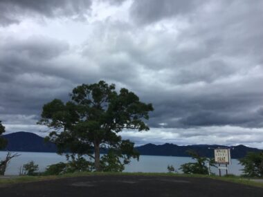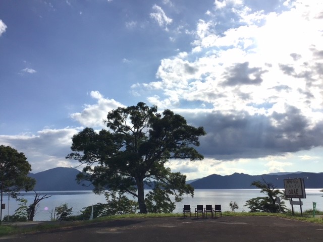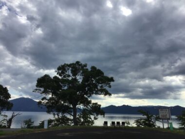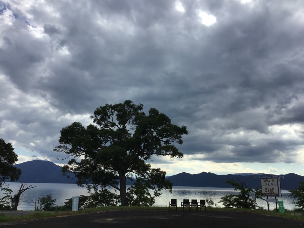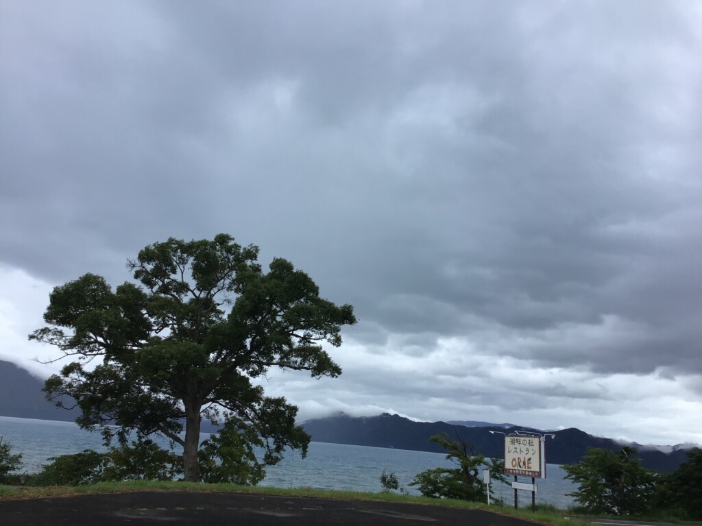 田沢湖には厚い雲がかかっています。