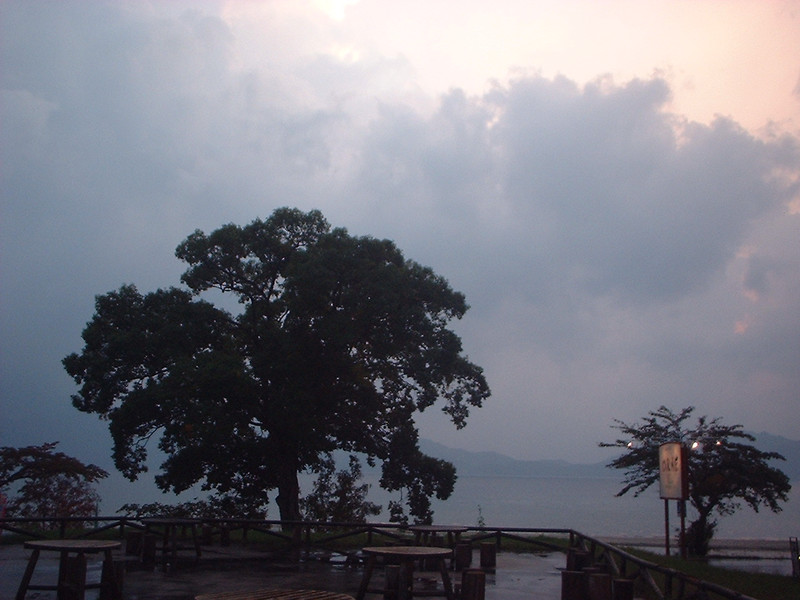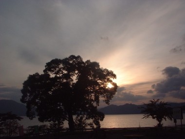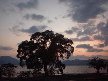 湖に夕陽が反射してピンク色の湖面です。