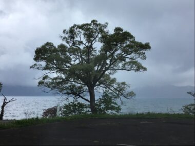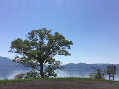 太陽の光に照らされて湖畔の木々の葉が鮮やかに輝いて見えます。